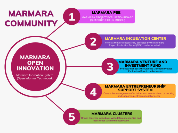 The Marmara Community serves as the overarching organization that houses the Marmara Open Innovation System and its various subgroups. Its primary goal is to establish an open, informal technopark that facilitates collaboration and innovation among its members.